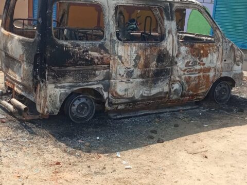अम्लेश्वर थाना के ग्राम घूघवा में एक युवक व उसके परिवार की दबंगई, सरपंच के भाई का चारपहिया वाहन को पुलिस के सामने ही कर दिया आग के हवाले