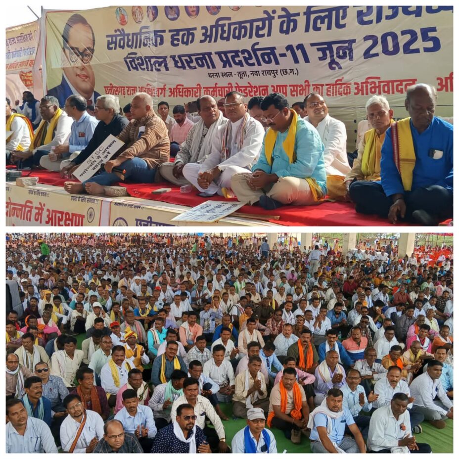 कुरैशी की रिपोर्ट छुरियाअनुसूचित जाति-जनजाति अधिकारी कर्मचारी फेडरेशन सहित एटी.एसी.वर्ग के 16 सामाजिक संगठनों के अगुवाई एवं सहभागिता से आरक्षित वर्ग के पदोन्नति में आरक्षण सहित 9 सूत्रीय मांगों को लेकर गत 11जून को तूता रायपुर में आयोजित राज्यव्यापी धरना-प्रदर्शन में राजनांदगाँव जिले के हजारों आदिवासी सामिल होकर अपनी आवाज़ बुलंद की। सर्व आदिवासी समाज के जिला संरक्षक, कोयतुर गोंड़ समाज ब्लाक इकाई छुरिया-डोंगरगढ़ के अध्यक्ष एवं अजजा शासकीय सेवक विकास संघ ब्लाक इकाई छुरिया के संरक्षक दिनेश कुरेटी दिलेर ने बताया कि छत्तीसगढ़ अजाक्स,अजजा शासकीय सेवक विकास संघ,छत्तीसगढ़ राज्य विद्युत मंडल आरक्षित वर्ग अधिकारी कर्मचारी कर्मचारी संघ एवं छत्तीसगढ़ सोशल जस्टिस एंड लीगल फाउंडेशन के संयुक्त तत्वावधान में छत्तीसगढ़ के अनुसूचित जाति एवं अनुसूचित जनजाति वर्ग के 16 सामाजिक संगठनों के अगुवाई एवं सहभागिता से गत 11जून को आरक्षित वर्ग के पदोन्नति में आरक्षण सहित आरक्षित वर्ग के 9 सूत्रीय मांगों को लेकर तुता मैदान नवा रायपुर में राज्यव्यापी धरना-प्रदर्शन किया गया जिसमें राज्य भर के अनुसूचित जाति एवं अनुसूचित जनजाति वर्ग के अधिकारी-कर्मचारी,सामाजिक संगठन के समाजिक प्रमुखों सहित आम जन हजारों की संख्या में उपस्थिति प्रदान किये।इसी कड़ी में राजनांदगाँव जिले के अनुसूचित जाति एवं अनुसूचित जनजाति वर्ग के लोग भी हजारों की संख्या में सामिल रहे। अनुसूचित जनजाति शासकीय सेवक विकास संघ एवं सर्व आदिवासी समाज की ओर से विभिन्न जाति समाज के लोग भी बड़ी संख्या में सामिल रहे। अजजा शासकीय सेवक विकास संघ एवं सर्व आदिवासी समाज की ओर से राजनांदगाँव जिले से धरना प्रदर्शन में सामिल होने वालों में लेखराम मात्रा,जसवंत घावड़े,छबिलाल चन्द्रवंशी, ललिता कंवर, दिनेश कुरेटी दिलेर, डेविड भुआर्य,हेमंत सलामें, रोमलाल मंडलोई, खेलनसिंह ठाकुर,भीषम ठाकुर,ईश्वर चन्द्रवंशी, चन्द्रशेखर उइके,कान्ता सोरी, ठाकुर राम चन्द्रवंशी,धनसाय सलामें,शेरसिंह गोंड़िया, सुरेश मंडावी, नाथूराम सूर्यवंशी,गिरधारी सहारे,उद्धव ठाकुर,तोमन आचले,रम्हऊ राम चन्द्रवंशी,लेखराम चन्द्रवंशी,नंदकुमार गोंड़िया,एवन आचले,देशराम कोर्राम,सुरेश रावटे,रेखूराम भुआर्य, नरेन्द्र सिंह ठाकुर,असऊ राम कारिहेरपार, दीनदयाल मंडावी,हरिराम चन्द्रवंशी, कुंवर सिंह मंडावी,बालमुकुन्द कुंजाम,प्यारे लाल मंडावी,राधेश्याम चन्द्रवंशी,चन्द्रभान कोर्राम, दिग्विजय नेताम,टी.आर.पन्द्रे,दिलीप कुमार कोरेटी,राजेश नेताम,अंजना आचले, झाड़ूराम ठाकुर, राजकुमार आचले,संजय सोरी,समय लाल मंडावी,तिलक खांडे,डेरहू राम चन्द्रवंशी,संजय कोर्राम, पुरुषोत्तम पडोटी,धुरसिंह