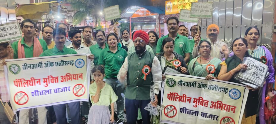 रायपुर(Raipur)28 जून 2025: पर्यावरण संरक्षण के प्रति अपनी प्रतिबद्धता दोहराते हुए, ग्रीन आर्मी छत्तीसगढ़ ने आज शीतला बाजार, पुरानी बस्ती में एक व्यापक जन जागरूकता रैली का आयोजन किया। यह रैली बूढ़ा गार्डन गेट से शुरू होकर, बुद्धेश्वर मंदिर और पूरे बाजार से होते हुए, महामाया मंदिर से वापस बूढ़ा गार्डन गेट पर समाप्त हुई, जिसका उद्देश्य क्षेत्र को पॉलीथिन मुक्त बनाने के लिए स्थानीय समुदाय को प्रेरित करना था।प्रकृति के लिए हानिकारक पॉलीथिन के खिलाफ मुखर होते हुए, रैली में “प्रकृति दुश्मन तीन – पाउच, पन्नी, पॉलीथिन”, “पॉलीथिन जहर है, पृथ्वी पर कहर है”, और “गौ माता करे पुकार, पॉलीथिन मुक्त हो संसार” जैसे नारों ने राहगीरों, व्यापारियों और आसपास के निवासियों का ध्यान आकर्षित किया।