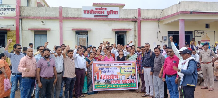 बी.संवर्ग के सैकड़ों शिक्षकों ने ब्लाक संचालक त्रय दिनेश कुरेटी,कीरत गणवीर एवं अमरदास बंजारे के संयुक्त कुशल नेतृत्व में चार सूत्रीय मांगों को लेकर 1जुलाई को सामुहिक अवकाश लेकर ब्लाक व तहसील मुख्यालय छुरिया में एक दिवसीय सांकेतिक धरना-प्रदर्शन कर एवं रैली निकालकर मुख्यमंत्री,शिक्षा सचिव एवं शिक्षण संचालक के नाम पर तहसीलदार एवं विकास खंड शिक्षा अधिकारी को लिखित ज्ञापन सौंपा।