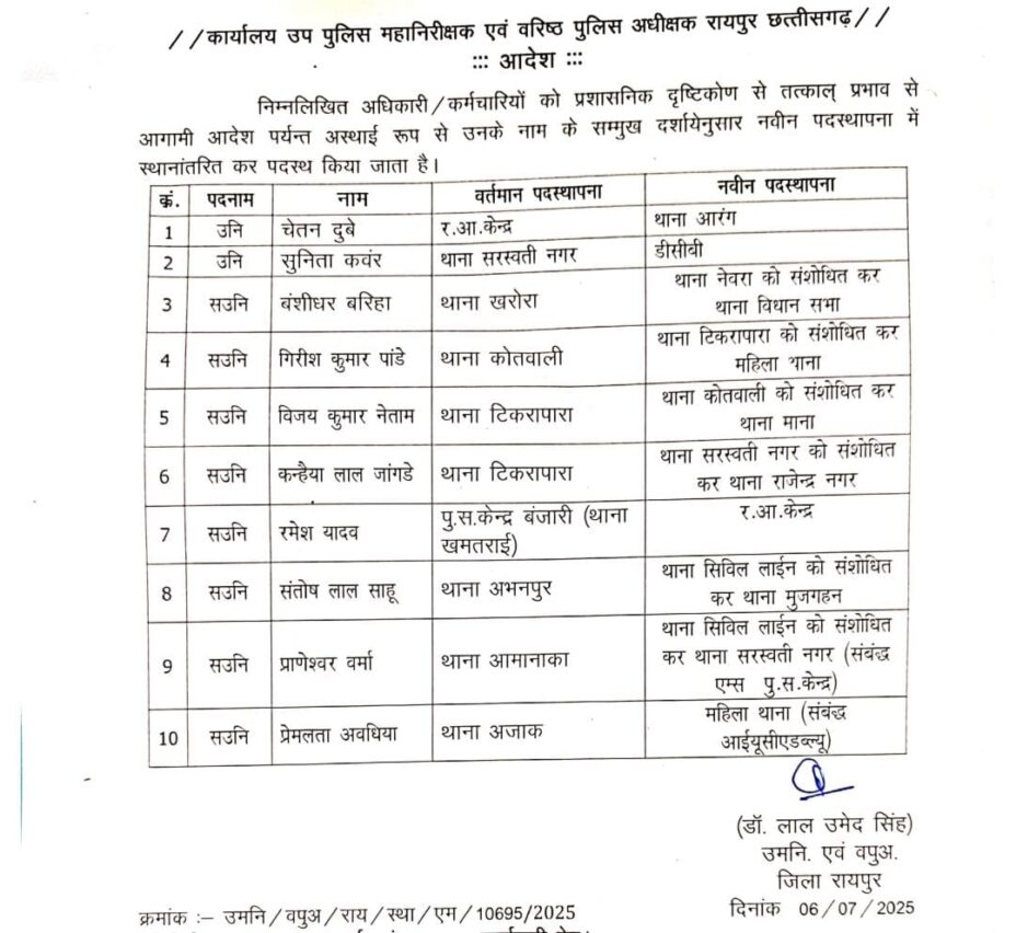 । राजधानी रायपुर के पुलिस विभाग में वर्षों से जमी मनमानी की जड़ आखिरकार उखड़ गई। खमतराई थाना में लंबे समय से पदस्थ ASI रमेश यादव को वरिष्ठ पुलिस अधीक्षक (SSP) लाल उम्मेद सिंह ने तत्काल प्रभाव से हटा दिया। ASI पर आरोप था कि वह कई वर्षों से एक ही थाने में जमे हुए थे और अपने आप को उच्च अधिकारियों से सीधा संपर्क वाला बताकर रौब गांठते थे।रमेश यादव का रवैया न केवल विभाग की गरिमा के विपरीत था, बल्कि उन पर कुछ कबाड़ियों और ट्रांसपोर्ट कारोबारियों से नजदीकियों के आरोप भी लगते रहे हैं। अपने प्रभाव और रसूख के दम पर वर्षों से एक ही जगह टिके रहने वाले इस ASI के खिलाफ जब शिकायतें लगातार सामने आने लगीं, तो SSP लाल उम्मेद सिंह ने बिना देर किए त्वरित कार्रवाई करते हुए उनका तबादला कर दिया।यह फैसला उन सभी पुलिस कर्मियों के लिए एक स्पष्ट संदेश है कि अनुशासनहीनता और पद के दुरुपयोग को अब बर्दाश्त नहीं किया जाएगा। SSP लाल उम्मेद सिंह की इस कार्रवाई को न केवल पुलिस विभाग के भीतर सराहा जा रहा है, बल्कि आम जनता भी इसे सही दिशा में उठाया गया कदम मान रही है।यह घटना इस बात की मिसाल है कि अब रायपुर पुलिस में ईमानदारी, पारदर्शिता और कर्तव्यनिष्ठा सर्वोपरि है, और गलत के खिलाफ कार्रवाई निश्चित है।SSP लाल उम्मेद सिंह अपनी वर्तमान भूमिका में रायपुर शहर में कानून-व्यवस्था बनाए रखने, अपराधों पर नियंत्रण, और पुलिस व्यवस्था में सुधार के लिए लगातार सक्रिय हैं। उनका नेतृत्व अपराधियों के लिए सख्ती और आम जनता के लिए सुरक्षा की गारंटी बन चुका है। पुलिसिंग को जन-मैत्री और जवाबदेह बनाने की दिशा में उनके प्रयासों की सराहना न सिर्फ आम नागरिक करते हैं, बल्कि प्रदेश स्तर पर सरकार और प्रशासनिक महकमा भी उन्हें एक ईमानदार, कड़क और कर्मठ अधिकारी के रूप में पहचानता है।