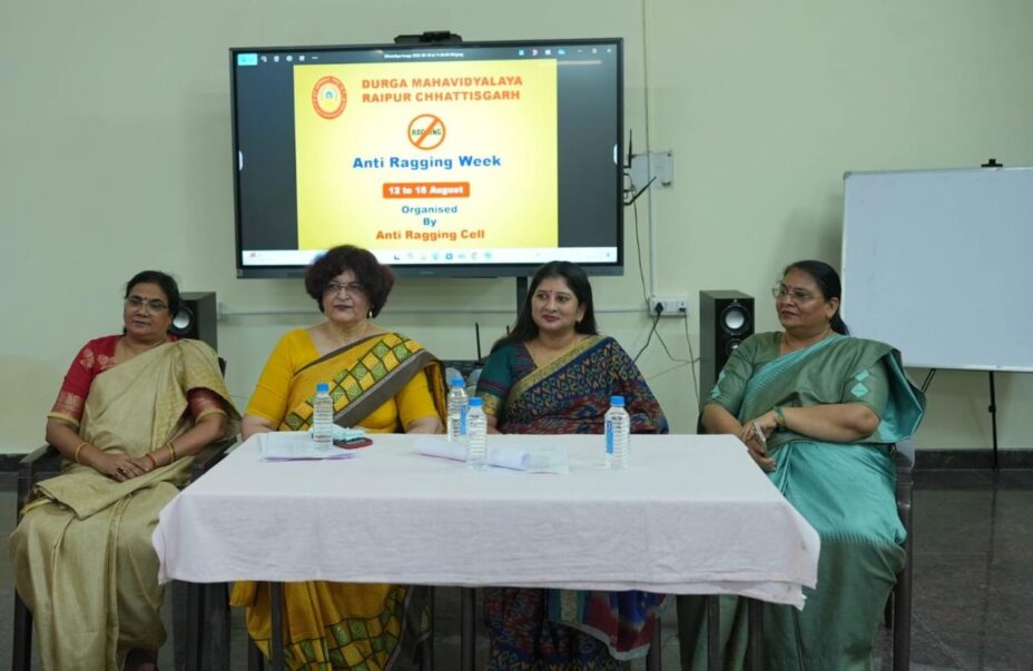रायपुर(Raipur)19 अगस्त: दुर्गा महाविद्यालय के एनएसएस (राष्ट्रीय सेवा योजना) विभाग द्वारा आयोजित एंटी रैगिंग वीक का समापन आज महाविद्यालय के सभा कक्ष में भव्य समारोह के साथ किया गया। इस अवसर पर छत्तीसगढ़ बाल अधिकार संरक्षण आयोग की अध्यक्षा डॉ. वर्णिका शर्मा मुख्य अतिथि के रूप में उपस्थित रहीं।कार्यक्रम में विद्यार्थियों द्वारा डॉ. वर्णिका शर्मा का गर्मजोशी से स्वागत किया गया। महाविद्यालय की प्राचार्या डॉ. प्रतिभा मुखर्जी ने स्वागत भाषण के माध्यम से समारोह की भूमिका प्रस्तुत की।