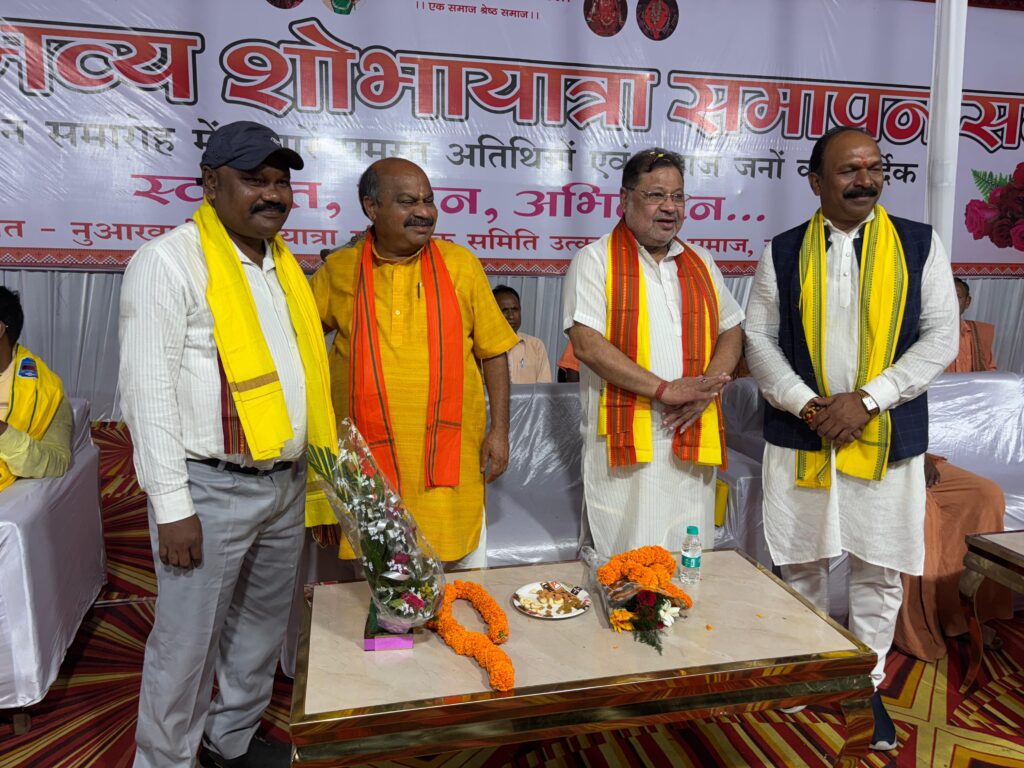 रायपुर(Raipur)25/08/2025: राजधानी रायपुर के मेमोरियल मैदान में गत संध्या नुआखाई भव्य शोभायात्रा का समापन समारोह बड़े हर्षोल्लास और पारंपरिक आस्था के साथ सम्पन्न हुआ। हजारों की संख्या में श्रद्धालुओं की उपस्थिति ने इस पर्व को और भी भव्य बना दिया।समारोह में उत्तर विधानसभा क्षेत्र के लोकप्रिय विधायक पुरंदर मिश्रा विशिष्ट अतिथि के रूप में शामिल हुए। उन्होंने इस अवसर पर छत्तीसगढ़ के मुख्यमंत्री विष्णुदेव साय द्वारा नुआखाई पर्व पर राज्य में सार्वजनिक अवकाश की घोषणा के लिए सम्पूर्ण उत्कल समाज एवं ओड़िया समाज की ओर से हार्दिक आभार व्यक्त किया।
