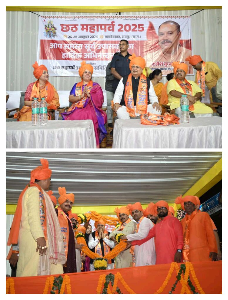 रायपुर(Raipur)28/10/2025: राजधानी रायपुर के महादेव घाट में छठ महापर्व 2025 का भव्य आयोजन श्रद्धा और उत्साह के साथ किया गया। कार्यक्रम में विधानसभा अध्यक्ष डॉ. रमन सिंह तथा रायपुर उत्तर विधायक पुरंदर मिश्रा विशेष अतिथि के रूप में सम्मिलित हुए। स्थानीय छठ महापर्व आयोजन समिति द्वारा अतिथियों का असगर माला पहनाकर गर्मजोशी से स्वागत किया गया।