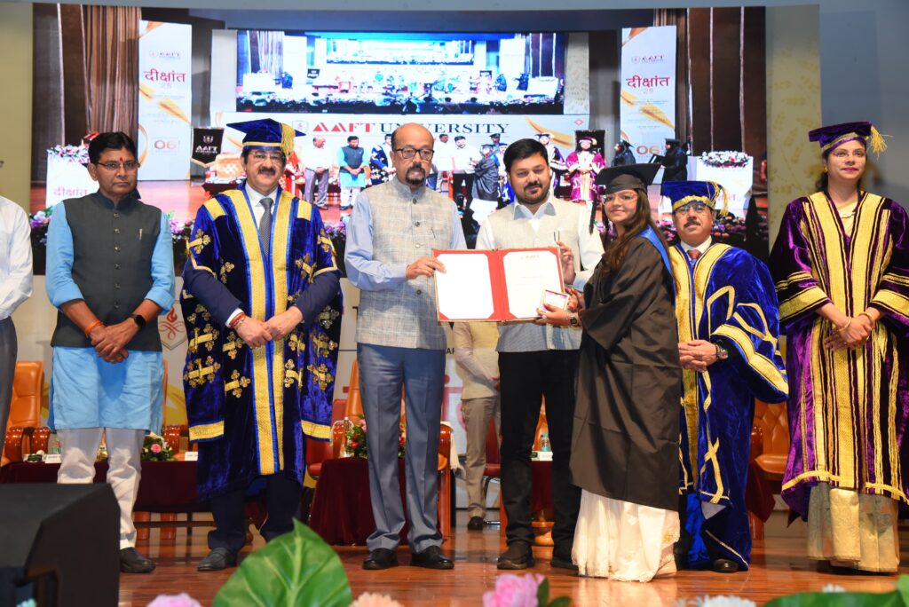रायपुर(Raipur)06-11-25: आज राजधानी रायपुर के AAFT University में दीक्षांत समारोह का आयोजन हुआ जिसमें छत्तीसगढ़ के राज्यपाल रमेन डेका व मंत्री टंकराम वर्मा के साथ धरसींवा विधायक अनुज शर्मा शामिल हुए। मुख्य अतिथियों द्वारा दीप प्रज्वलित कर कार्यक्रम का शुभारंभ किया|विधायक अनुज शर्मा ने संबोधित करते हुए कहा कि इस गौरवशाली दीक्षांत समारोह पर मुझे अत्यंत हर्ष और गर्व की अनुभूति हो रही है। यह केवल एक शैक्षणिक अवसर नहीं, बल्कि आत्मविकास, समर्पण और सृजनशीलता का उत्सव है। शिक्षा का वास्तविक उद्देश्य केवल ज्ञान अर्जन नहीं, बल्कि उस ज्ञान को जीवन के कार्यशैली और उपयोगी रूप में ढालना है।