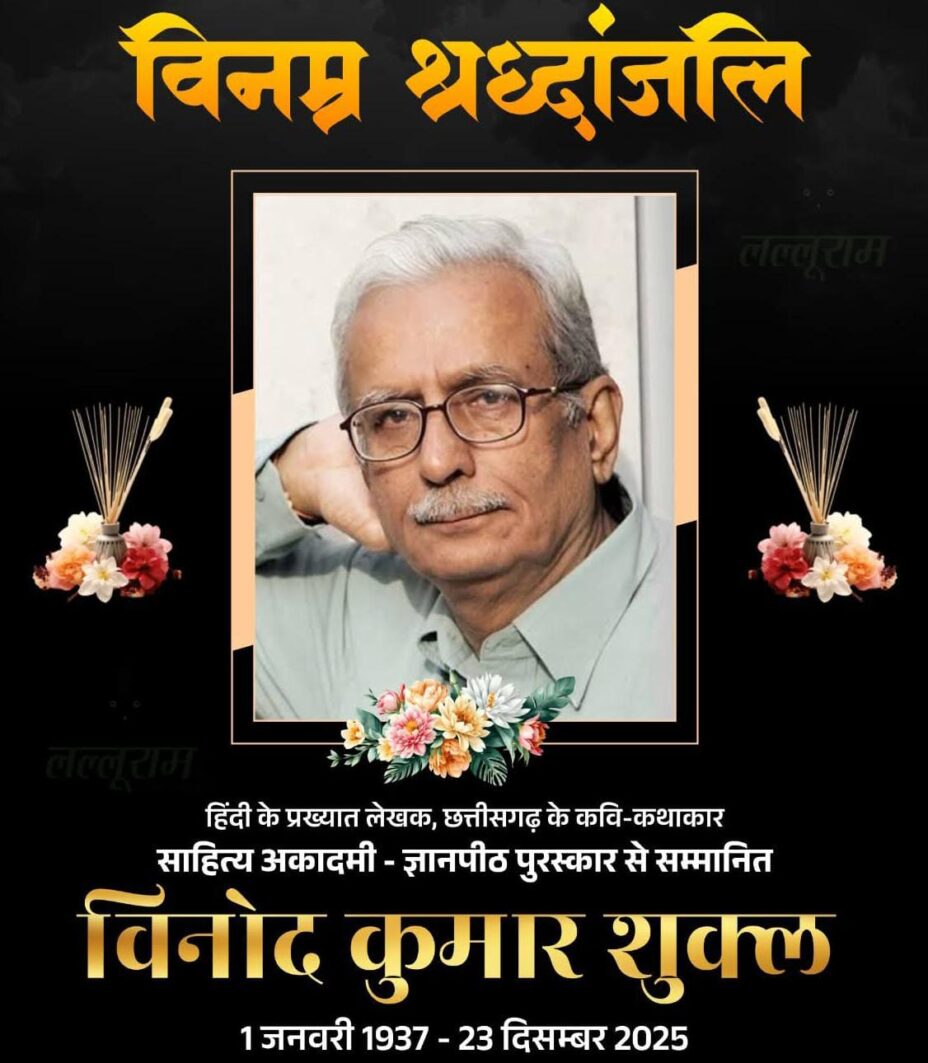 रायपुर(Raipur)23 दिसंबर 2025: छत्तीसगढ़ के गौरव, वरिष्ठ एवं विख्यात साहित्यकार विनोद कुमार शुक्ल के निधन पर मुख्यमंत्री विष्णुदेव साय ने गहरा शोक व्यक्त किया है। मुख्यमंत्री साय ने कहा कि विनोद कुमार शुक्ल का निधन हिंदी साहित्य और छत्तीसगढ़ की सांस्कृतिक चेतना के लिए अपूरणीय क्षति है। मुख्यमंत्री ने कहा कि नौकर की कमीज और दीवार में एक खिड़की रहती थी जैसी कालजयी कृतियों के माध्यम से विनोद कुमार शुक्ल ने साधारण जीवन को असाधारण गरिमा प्रदान की। उनकी लेखनी में मानवीय संवेदना, सादगी और जीवन की सूक्ष्म अनुभूतियाँ अत्यंत सहजता से अभिव्यक्त होती थीं, जिसने पाठकों की अनेक पीढ़ियों को गहराई से प्रभावित किया।