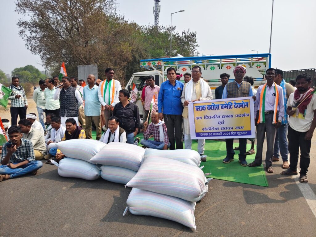 रायपुर(Raipur)30 जनवरी 2026: मनरेगा बचाओ के तहत कांग्रेस ने महात्मा गांधी की पुण्यतिथि के अवसर पर ब्लॉको में धरना प्रदर्शन किया तथा धान खरीदी की तिथि बढ़ाने की मांग को लेकर कांग्रेस ने प्रदेश के अनेकों स्थानों पर सांकेतिक चक्का जाम किया। कांग्रेस की मांग है कि सरकार प्रदेश के सभी किसानों का धान समर्थन मूल्य पर खरीदे। अभी भी प्रदेश के लाखों किसान अपना धान नहीं बेच पाये है। भाजपा सरकार किसानों से धोखा कर रही है। सरकार 1 माह तक धान खरीदी की तिथि आगे बढ़ाये।
