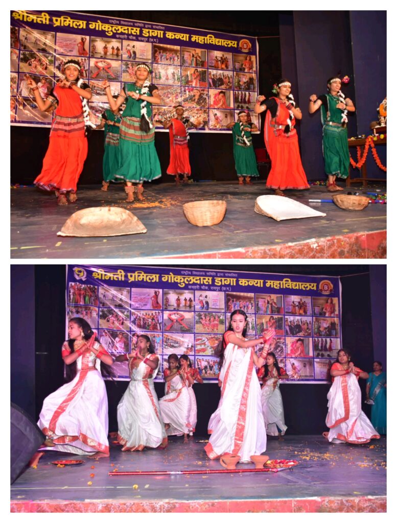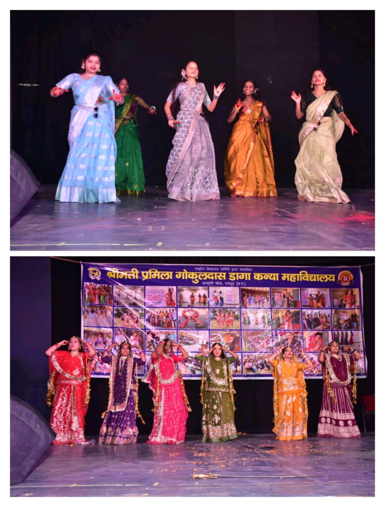 छात्राओं के विशेष अनुरोध पर पद्मश्री डॉ अनुज शर्मा द्वारा लोकप्रिय छत्तीसगढ़ी गीत प्रस्तुत किया गया है जिससे छात्राएं उत्साहित होकर नृत्य करने लगीं।सांस्कृतिक कार्यक्रम का शुभारंभ बी.एससी. की छात्रा रिद्धिमा द्वारा आकर्षक गणेश वंदना से किया गया। इसके पश्चात छात्राओं द्वारा छत्तीसगढ़ी समूह नृत्य “बारामासी” की सुंदर प्रस्तुति दी गई, जिसे दर्शकों ने खूब सराहा।इस अवसर पर निकिता कर्माकर ने “मोहे रंग दो लाल” गीत पर मनमोहक कथक नृत्य प्रस्तुत किया।