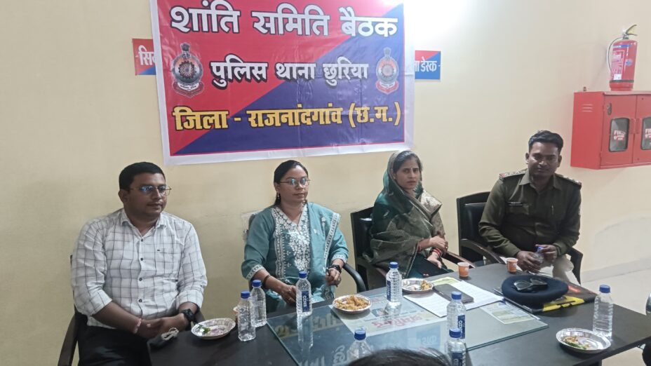 छुरिया। आगामी होली पर्व को शांतिपूर्वक एवं सौहार्दपूर्ण वातावरण में मनाने के उद्देश्य से थाना छुरिया परिसर में शांति समिति की बैठक आयोजित की गई। दिनांक 26.02.2026 दिन शनिवार को पुलिस अधीक्षक राजनांदगांव सुश्री अंकिता शर्मा के निर्देश पर अतिरिक्त पुलिस अधीक्षक श्री कीर्तन राठौर एवं पुलिस अनुविभागीय अधिकारी डोंगरगढ़ श्री केशरीनंदन नायक के मार्गदर्शन में थाना प्रभारी छुरिया निरीक्षक कौशलेश देवांगन के नेतृत्व में बैठक संपन्न हुई।