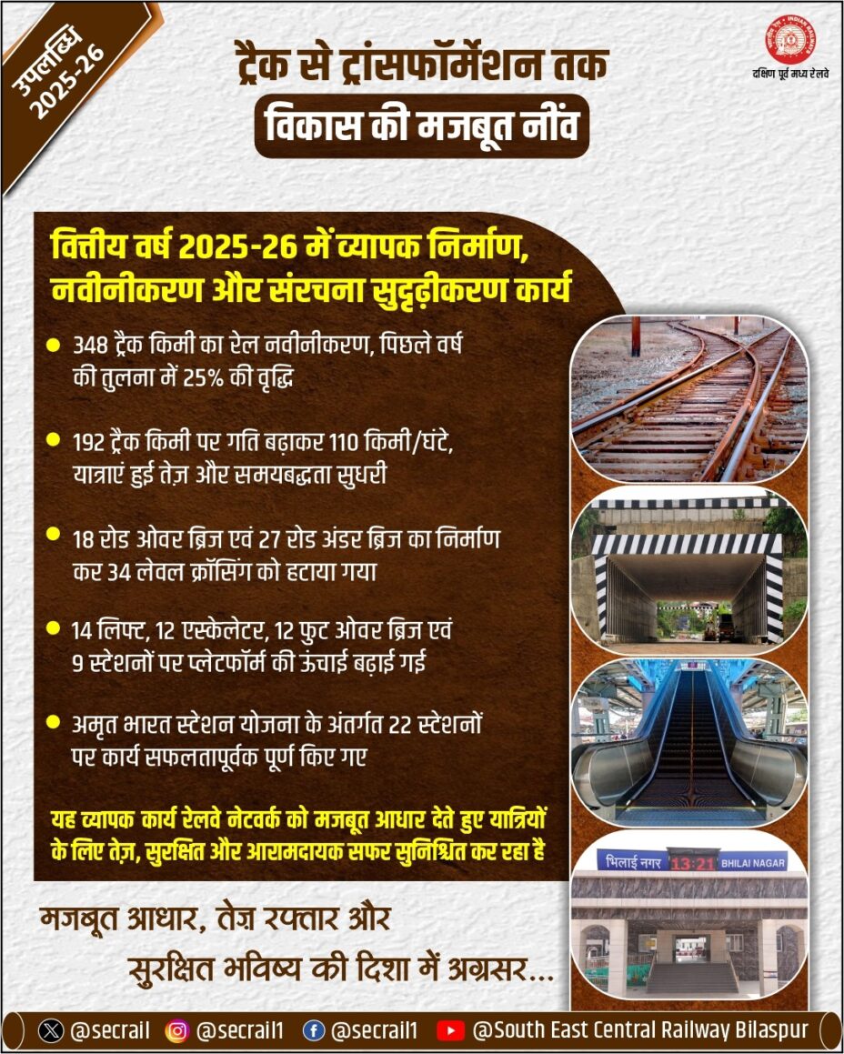 रायपुर(Raipur) बिलासपुर 06 अप्रैल 2026: रेलवे नेटवर्क की मजबूती उसकी पटरियों, पुलों और आधारभूत संरचना पर निर्भर करती है। वित्तीय वर्ष 2025–26 के दौरान दक्षिण पूर्व मध्य रेलवे के सिविल इंजीनियरिंग विभाग ने व्यापक स्तर पर अनुरक्षण, निर्माण एवं आधुनिकीकरण कार्य करते हुए न केवल भौतिक ढांचे को सुदृढ़ किया, बल्कि यात्रियों एवं आम नागरिकों के जीवन को भी अधिक सुरक्षित और सुगम बनाया है। यह उपलब्धियाँ रेलवे के सतत विकास और जनसेवा के प्रति उसकी प्रतिबद्धता को स्पष्ट रूप से दर्शाती हैं। इस वर्ष ट्रैक नवीनीकरण कार्य में उल्लेखनीय वृद्धि दर्ज की गई। कुल 348 ट्रैक किलोमीटर का प्राथमिक रेल नवीनीकरण किया गया, जो पिछले वर्ष की तुलना में 25% अधिक है। इसके साथ ही 271 किमी स्लीपर नवीनीकरण (21% वृद्धि) किया गया। इसके साथ ही ट्रैक की गुणवत्ता में सुधार से ट्रेन संचालन अधिक विश्वसनीय हुआ है, जिससे यात्रियों को बेहतर यात्रा अनुभव के साथ अपने गंतव्य तक पहुंच में सुविधा मिल रही है।