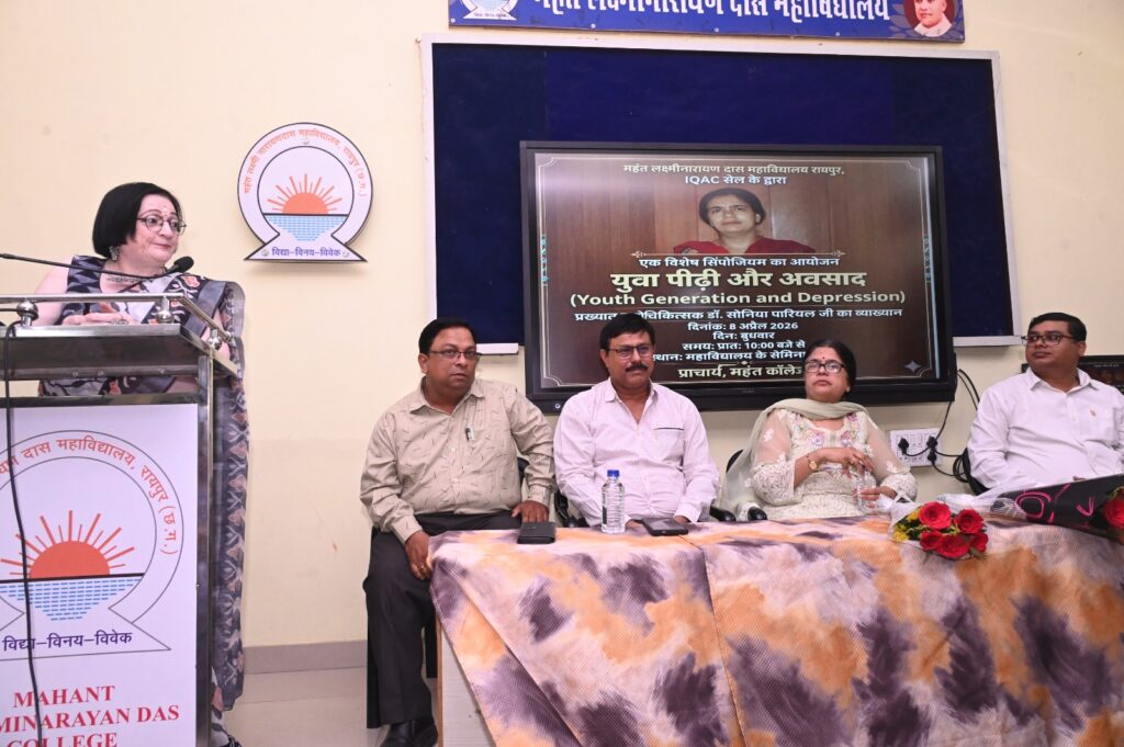 रायपुर(Raipur) महंत लक्ष्मी नारायण दास महाविद्यालय गांधी चौक रायपुर में युवा पीढ़ी और अवसाद विषय पर एक दिवसीय व्याख्यान का आयोजन हुआ इस महत्वपूर्ण विषय में प्रख्यात मनोचिकित्सक डॉक्टर सोनिया परियल विशेषज्ञ वक्ता के रूप में शिरकत की वहीं आयोजन में महाविद्यालय के प्राचार्य डॉ देवाशीष मुखर्जी ,आइक्यूएसी सेल के डॉ प्रेमचंद्राकार डॉ शांतनु पाल सहित प्राध्यापकों की विशेष मौजूदगी रही महाविद्यालय के बच्चों में विषय को रेखांकित करने के लिए यह आयोजन किया गया था इस विषय पर विचार रखते हुए विशेषज्ञ वक्ता डॉ सोनिया परियल ने कहा कि वर्तमान परिप्रेक्ष्य में युवाओं में अवसाद के मामले असुक्षा और नशे की बढ़ती प्रवृत्ति के कारण सामने आ रहे हैं उनका कहना था कि अवसाद की कई स्वरूप हो सकते हैं ।
