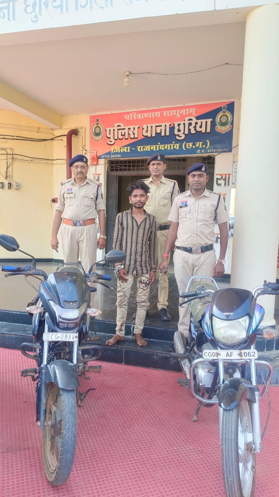 थाना धुरिया के अपराध क्रमांक 42/2026 पारा 303(2) बीएनएस एंव 75/2026 बारा 303(2) बीएनएस के मामले में अज्ञात आरोपी के खिलाफ अपराध कायम कर विवेचना में लिया गया था विवेचना के दौरान दिनांक 16.04.2026 को मुखचीर सूचना से प्राप्त हुआ की एक व्यक्ति बस स्टैण्ड छुरिया के पास कम कीमत पर मोटर सायकल बेचने के लिए ग्राहक की तलाश करने की सूचना प्राप्त होने पर मुखबीर सूचना की तस्दीक हेतू गवाह तलब कर छुरिया द्वारा बस स्टैण्ड के पास पहुंच कर मुखबीर द्वारा बताये हुलिये के व्यक्ति दिखने पर खेराबंदी कर पकड कर उसके नाम पता पुछने पर मुलंचद सिन्हा उर्फ रवि पिता संतोष उम्र 26 साल निवासी मोहबा पुलिस चौकी चिखली थाना कोतवाली जिला राजनांदगांव का रहने वाला बताया व अपने मेमोरेण्डम कथन में बताया की यह दिनांक 02.03. 2026 को ग्राम बोईरडीह रोड किनारे खड़ी हुई मोटर सायकल एच०एफ डीलक्स सीजी 08 यु 5793 को चोरी कर चलाते ले जा रहा था मो०सा० में पेट्रोल खत्म होने पर उस मो०सा० को छुरिया चिचोला रोड बापुटीला चौक के पहले पेड़ के निचे रखना तथा दिनांक 05.04.2026 को शासकीय शराब भटटी चंदैनिडीह के चखना दुकान के सामने खड़ी मोटर सायकल मो०सा० एच०एफ डीलक्स क्रमांक सीजी 08 ए एफ 1062 को चोरी करना मोटर सायकल ले जाते समय पेट्रोल खत्म होने पर गौरी नाला पुलिया के पास झाडीयो में छिपा कर रखने का कथन देने पर आरोपी मुलंचद सिन्हा उर्फ रवि पिता संतोष उम्र 26 साल निवासी मोहबा पुलिस चौकी चिखली के निशांनदेही में मोटर सायकल को दिनांक 16.04.2026 को जप्त किया जाकर विधिवत कार्यवाही कर आरोपी गिरफतार कर न्यायिक अभिरक्षा में भेजा गया है। उक्त कार्यवाही में निरीक्षक कौशलेश देवांगन, सउिन उदय सिंह चंदेल, प्रआर0 1335 मनोज कुमार साहू आर0 160 देवीलाल साहू, आर0 460 फूलेन्द्र राजपूत की सराहनीय भूमिका रही।